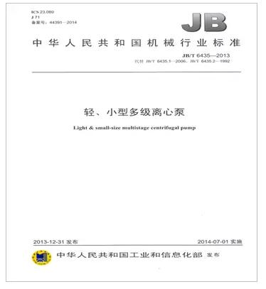 由南方泵業(yè)股份有限公司主導(dǎo)編制的機(jī)械行業(yè)標(biāo)準(zhǔn)JB/T6435-2013《輕、小型多級離心泵》于2013年12月31日發(fā)布,并于2014年7月1日正式實(shí)施。該標(biāo)準(zhǔn)由國家工業(yè)和信息化部發(fā)布,代替JB/T 6435.1-2006;JB/T 6435.2-1992。