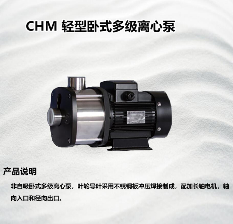 南方CHM 輕型臥式多級離心泵非自吸臥式多級離心泵,葉輪導葉采用不銹鋼板沖壓焊接制成,配加長軸電機,軸向入口和徑向出口。性能及優點:結構緊湊、高效率、低噪音、適用于輕度腐蝕性液體、安裝空間小、安裝拆卸簡單,便于維修