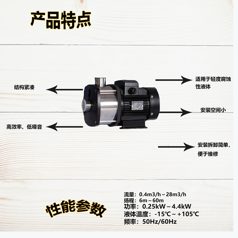 結構緊湊、高效率、低噪音、適用于輕度腐蝕性液體、安裝空間小、安裝拆卸簡單,便于維修