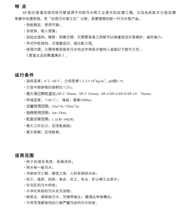 南方SP單級單吸無堵塞自吸式排污泵,開式無堵塞葉輪,軸向入口和徑向出口,采用后拉式結(jié)構(gòu),維修無須拆除泵體及管路。